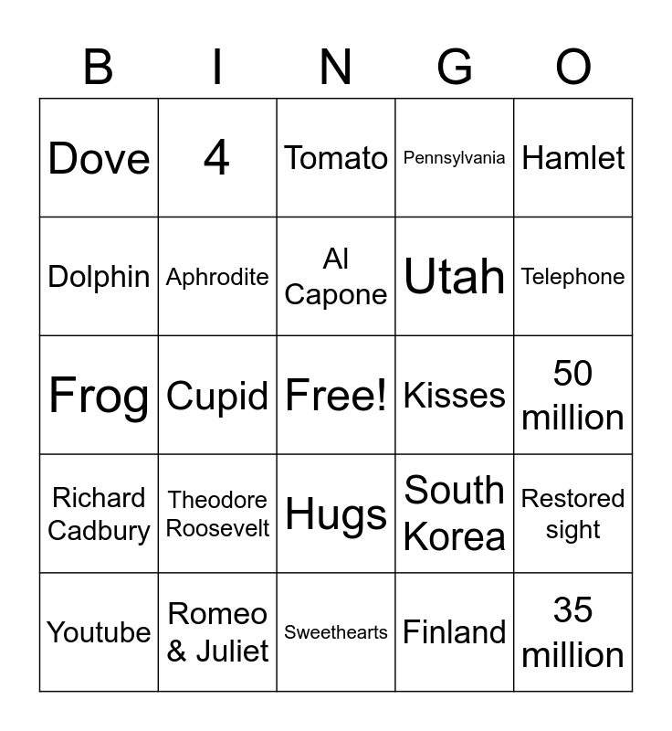 This bingo card has a free space and 30 words: Romeo & Juliet, Sleeve, Cupid, Friendship, Dove, Tomato, Aphrodite, Hugs, Kisses, Sweethearts, 50 million, 35 million, Finland, California, Telephone, 1 billion, South Korea, Richard Cadbury, Theodore Roosevelt, Hamlet, Frog, Psyche, 4, Utah, Dolphin, Pennsylvania, Restored sight, Youtube, Al Capone and Groundhog Day.