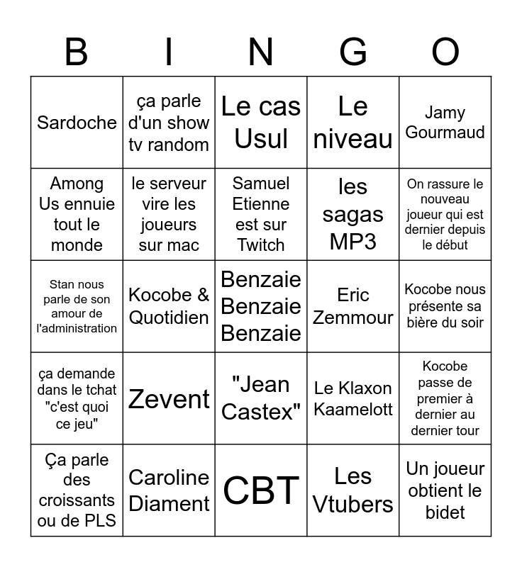 This bingo card has a free space and 24 words: Zevent, Caroline Diament, Samuel Etienne est sur Twitch, Ça parle des croissants ou de PLS, Jamy Gourmaud, Sardoche, Among Us ennuie tout le monde, ça parle d'un show tv random, Eric Zemmour, "Jean Castex", les sagas MP3, Stan nous parle de son amour de l'administration, Le Klaxon Kaamelott, Kocobe passe de premier à dernier au dernier tour, le serveur vire les joueurs sur mac, Les Vtubers, Kocobe nous présente sa bière du soir, Le cas Usul, On rassure le nouveau joueur qui est dernier depuis le début, Kocobe & Quotidien, Un joueur obtient le bidet, ça demande dans le tchat "c'est quoi ce jeu", Le niveau and CBT.