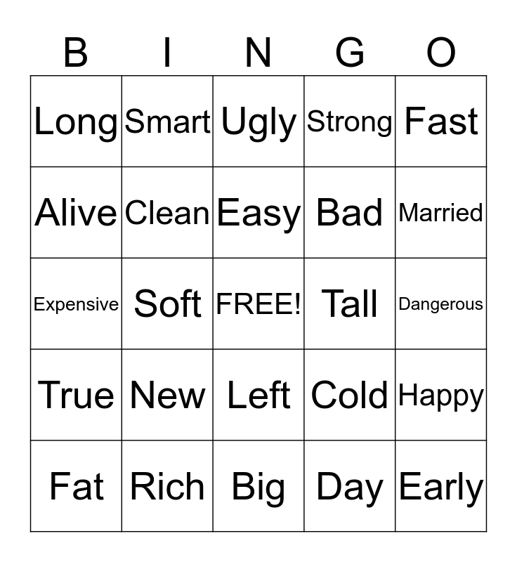 This bingo card has a free space and 24 words: New, Rich, Easy, Fat, Fast, Long, Alive, Smart, Tall, Left, Bad, Expensive, Cold, Happy, Clean, Day, Dangerous, Ugly, Married, Soft, Early, True, Strong and Big.