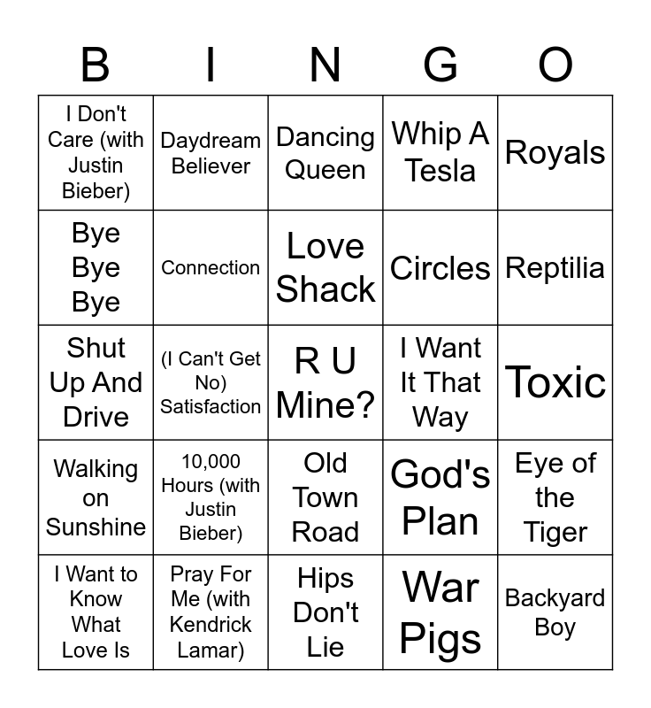 This bingo card has 147 words: Campus, Feel Good Inc., Seven Nation Army, Beverly Hills, Toosie Slide, God's Plan, Ripple, UCLA, Dead To Me, Tear in My Heart, Short Skirt / Long Jacket, Tongue Tied, Float On, Sweater Weather, The Middle, Mamma Mia, Waterloo, T.N.T., Thunderstruck, Another Brick in the Wall, Pt. 2, Immigrant Song, Eye of the Tiger, Smoke on the Water, Brass Monkey, Dream On, (I Can't Get No) Satisfaction, Daydream Believer, Wake Me Up Before You Go-Go, Uptown Girl, I Walk the Line, FourFiveSeconds, Here Comes The Sun, Hey Jude, Toxic, Poker Face, Lip Gloss, (Ghost) Riders in the Sky, She Will Be Loved, Circles, Basket Case, This Is America, Never Gonna Give You Up, Old Town Road, Love Story, Everybody Wants To Rule The World, I'll Make a Man Out of You, A Whole New World, Life is a Highway, Everywhere You Look, Hold On Loosely, thank u, next, Careless Whisper, I Want to Know What Love Is, I Wanna Dance with Somebody, Like A G6, Up Town Girl, Misery Business, Shallow, I Believe I Can Fly, Emotions, Dancing Queen, Backyard Boy, Midnight Sky, I'm Still Standing, 9 to 5, I Want It That Way, Walking on Sunshine, Sweet Caroline, Needed Me, Gold Digger, Hot In Here, Before He Cheats, I Don't Care (with Justin Bieber), Don't Stop Me Now, Jessie's Girl, Honey Bee, Since U Been Gone, You'll Always Find Your Way Back Home, Big Time Rush, Whip A Tesla, Don't Doubt ur Vibe, I Write Sins Not Tragedies, Wagon Wheel, I Need Your Love (ft. Ellie Goulding), Sweet but Psycho, I'm Just a Bill, Not Afraid, Wannabe, Forget You, Hips Don't Lie, 22, Burnin' Up, Fabulous, Take on Me, Pray For Me (with Kendrick Lamar), Money Ain't A Thang, Tangerine, XO Tour Llif3, Lucid Dreams, Backseat Freestyle, Jumpman, HIGHEST IN THE ROOM, Bye Bye Bye, Good Things Fall Apart, Glad You Exist, Bang!, Weak, All Star, Footprints On The Moon, Love You Like the Movies, YOUTH, On Me, Connection, 10,000 Hours (with Justin Bieber), Someday, Reptilia, I Bet You Look Good On The Dance Floor, R U Mine?, Royals, Bulletproof, Shut Up And Drive, Rehab, Wellerman, Love Shack, Mr. Brightside, Banana Pancakes, War Pigs, Sunflower, Hey Mickey, We Didn't Start the Fire, Sk8er Boi, Stacey's Mom, Honey, I'm Good., Best Day Of My Life, Shut Up and Dance, The Best of Both Worlds, American Pie, Keep Your Head Up, I Found A Way, Levitating (feat. DaBaby), CHAMPION, Stolen Dance, The Devil Went Down to Georgia, The Woo, Hot (ft. Gunna and Travis Scott), All Summer Long and Boulevard of Broken Dreams.