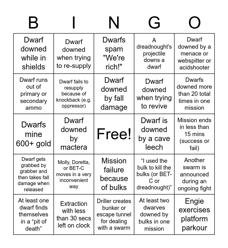 This bingo card has a free space and 48 words: Scout or driller is the last one alive, Engie exercises platform parkour, Gunner uses shield to revive teammate at least 3 times in a mission, Driller creates bunker or escape tunnel for dealing with a swarm, Molly, Doretta, or BET-C moves in a very inconvenient way, Re-supply lands on a bug or dwarf, Dwarf downed when trying to re-supply, Dwarfs call at least 5 resupplies in the same mission, Dwarf runs out of primary or secondary ammo, Dwarfs accumulate 400+ nitra, Dwarf fails to resupply because of knockback (e.g. oppressor), A dreadnought's projectile downs a dwarf, Another swarm is announced during an ongoing fight, “I used the bulk to kill the bulks (or BET-C or dreadnought)”, At least two BET-C’s are repaired in the same mission, At least two dreadnoughts on the map at the same time, Dwarf downed by fall damage, Dwarf is downed by a cave leech, Dwarf downs a teammate or themself with their own explosives, Dwarf downed by a menace or webspitter or acidshooter, Dwarf downed by mactera, At least two dwarves downed by bulks in one mission, Dwarf downed while in shields, Dwarf downed when trying to revive, Dwarf fails to revive because of knockback (e.g. oppressor), Dwarfs downed more than 20 total times in one mission, At least one dwarf finds themselves in a “pit of death”, Mission failure during a machine event or BET-C encounter, Mission failure because of bulks, Dwarf gets grabbed by grabber and then takes fall damage when released, Dwarfs recover from situation where only one dwarf is up, Dwarfs chain revive at least 3 times in a row, Dwarfs forced to use iron will to continue mission, Dwarfs survive for more than 30 mins, Extraction with less than 30 secs left on clock, Dwarf successfully uses iron will to revive a teammate or stay alive, Escape pod, minehead, pumpjack, or uplink/refuel lands in a very inconvenient place, Mission ends in less than 15 mins (success or fail), Dwarfs successfully defend a point (uplink, fuel cells, or blackbox), Extraction with more than 3 mins left on clock, Dwarfs complete a mission, Dwarfs attempt an escort mission, Dwarfs spam "We're rich!", Dwarfs find and deposit an error cube or bittergem, Dwarfs mine 600+ gold, Dwarfs complete the secondary objective, Cargo crate or lost helmet treasure discovered and Dwarfs spam “Mushroom”.