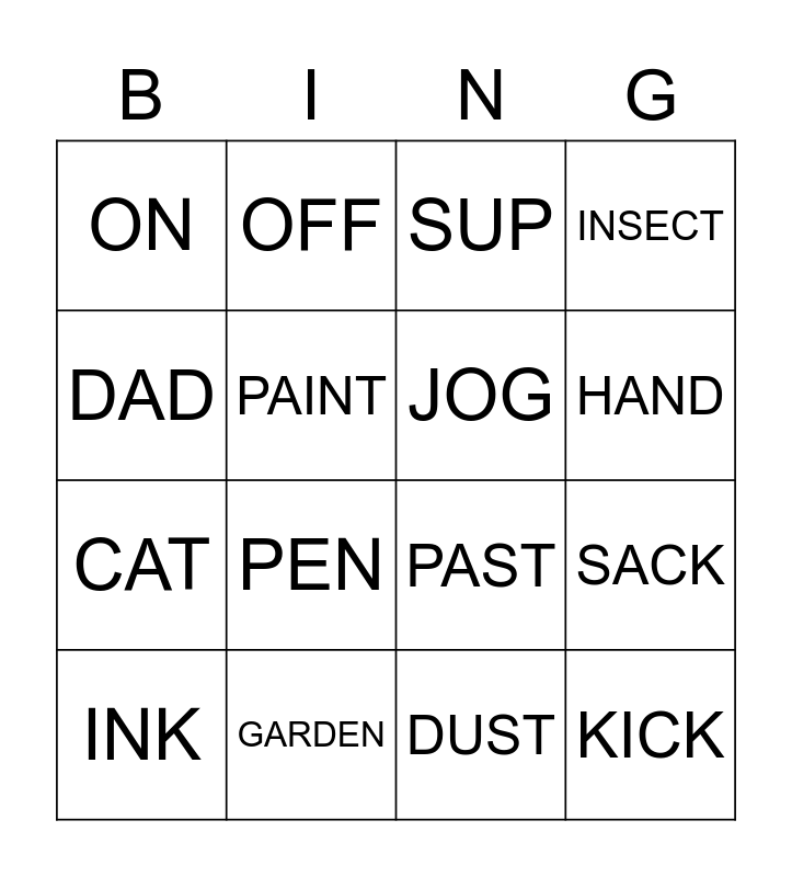 This bingo card has 19 words: PAST, TAS, SUP, KICK, SACK, DAD, DUST, ON, OFF, CAT, PEN, PAINT, JOG, GARDEN, INK, IN, INSECT, HAND and SUN.