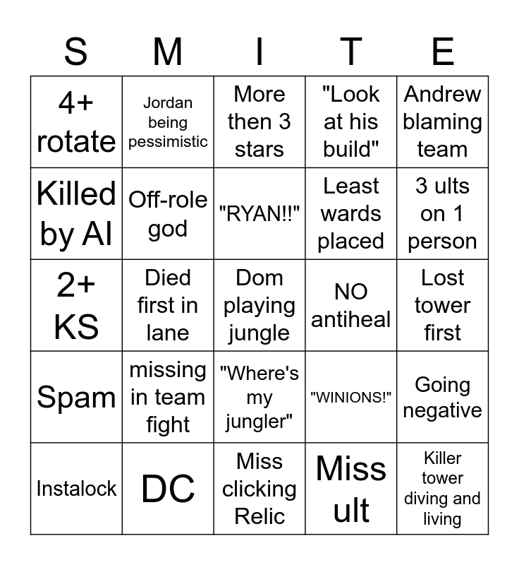 This bingo card has a free space and 24 words: Instalock, missing in team fight, "RYAN!!", Miss ult, Andrew blaming team, 4+ rotate, Jordan being pessimistic, More then 3 stars, NO antiheal, Lost tower first, 2+ KS, Off-role god, "WINIONS!", Going negative, Killed by AI, DC, Miss clicking Relic, "Look at his build", 3 ults on 1 person, Spam, Died first in lane, "Where's my jungler", Least wards placed and Killer tower diving and living.
