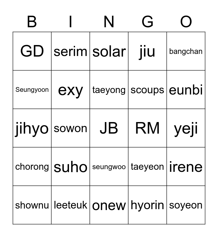 This bingo card has a free space and 24 words: suho, leeteuk, taeyong, shownu, bangchan, GD, Seungyoon, serim, RM, seungwoo, scoups, jihyo, taeyeon, irene, exy, hyorin, yeji, solar, eunbi, sowon, soyeon, chorong, jiu and onew.