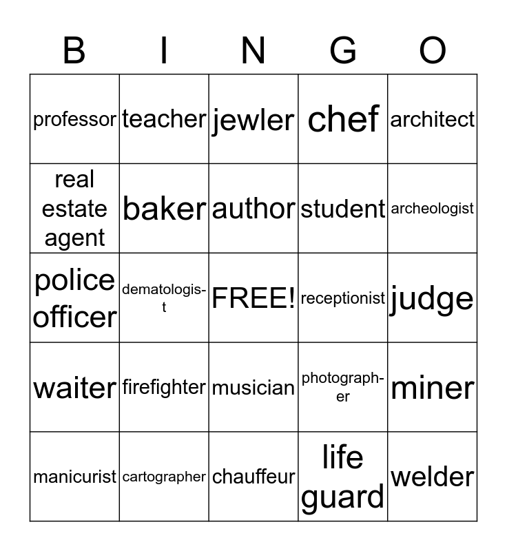 This bingo card has a free space and 24 words: firefighter, cartographer, author, manicurist, architect, professor, real estate agent, teacher, receptionist, musician, student, police officer, photograph-er, miner, baker, life guard, judge, jewler, archeologist, dematologis-t, welder, waiter, chef and chauffeur.