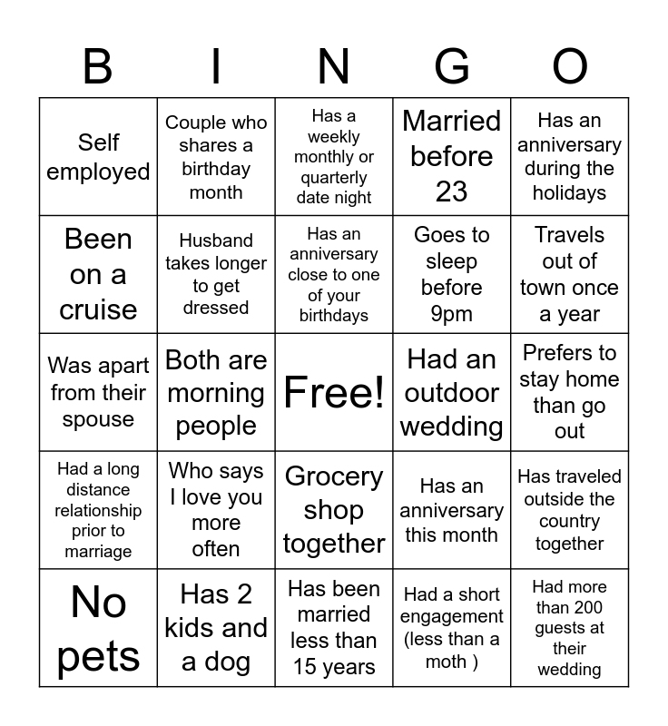 This bingo card has a free space and 24 words: Who says I love you more often, Has 2 kids and a dog, Has an anniversary close to one of your birthdays, No pets, Has an anniversary during the holidays, Self employed, Been on a cruise, Couple who shares a birthday month, Had an outdoor wedding, Grocery shop together, Goes to sleep before 9pm, Was apart from their spouse, Has an anniversary this month, Has traveled outside the country together, Husband takes longer to get dressed, Had a short engagement (less than a moth ), Prefers to stay home than go out, Has a weekly monthly or quarterly date night, Travels out of town once a year, Both are morning people, Had more than 200 guests at their wedding, Had a long distance relationship prior to marriage, Married before 23 and Has been married less than 15 years.