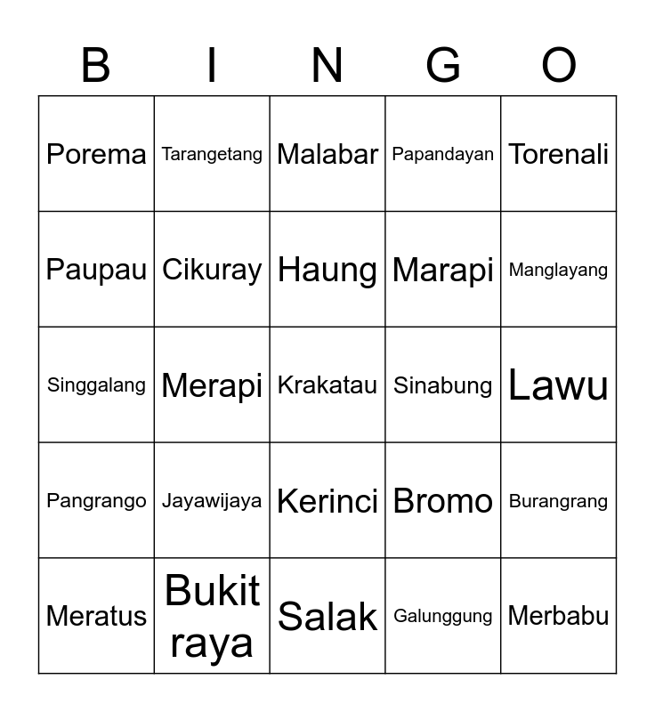 This bingo card has a free space and 24 words: Jayawijaya, Bukit raya, Haung, Meratus, Torenali, Porema, Paupau, Tarangetang, Sinabung, Kerinci, Marapi, Singgalang, Bromo, Burangrang, Cikuray, Galunggung, Lawu, Malabar, Manglayang, Merapi, Merbabu, Pangrango, Papandayan and Salak.