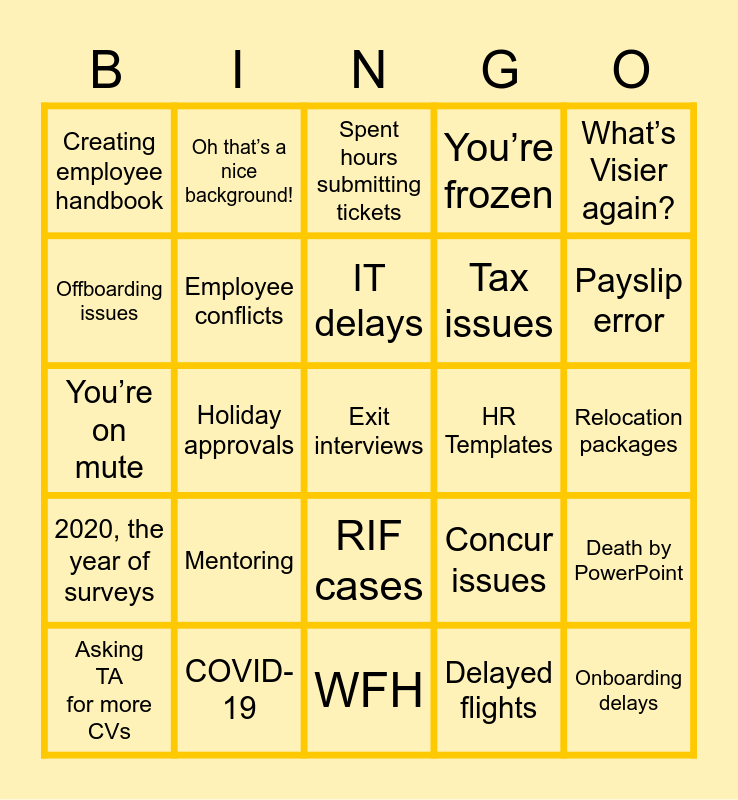 This bingo card has 75 words: Acted as IT support, Complaints about dress code, Spent hours submitting tickets, Monitors >1 email inbox, Payroll error, Process changes, New vendor, Mediating arguments, Tough conversations, Disciplinary action, Onboarding delays, Broken laptops, IT delays, Offboarding issues, SNOW issues, Holiday approvals, LAN ID, Exit interviews, Can’t find the SAP info you need, What’s Visier again?, Sorry, what is Slack?, You’re on mute, Employee conflicts, Oh that’s a nice background!, You’re frozen, Awww your children are cute, Is that your dog?, Acted as a admin support, HR customer support, Recruitment delays, Employee wants a promotion, Employee salary/merit increase, Insurance claims, Concur issues, Payslip error, Tax issues, International transfers, Employee visas, Relocation packages, Delayed flights, DE&I requests, BRG meetings, Market medians, Internal medians, C&B data conflicts, Bad first interviews, Asking TA for more CVs, Creating employee handbook, Awkward interview responses, Late to an interview, ‘Emotional’ employees, RIF cases, Simply Excellence awards, SIP rollout, SIP changes, Harassment cases, Security breaches, Integrity/ethics cases, eLearning, Inputting goals, Mentoring, People Managers, Restrux ID, Campus hiring, BTL/ATL, HR Templates, Workforce Planning, NDPT, IDM Team, Death by PowerPoint, 2020, the year of surveys, COVID-19, Sanitisation protocol, WFH and Return to work meeting.