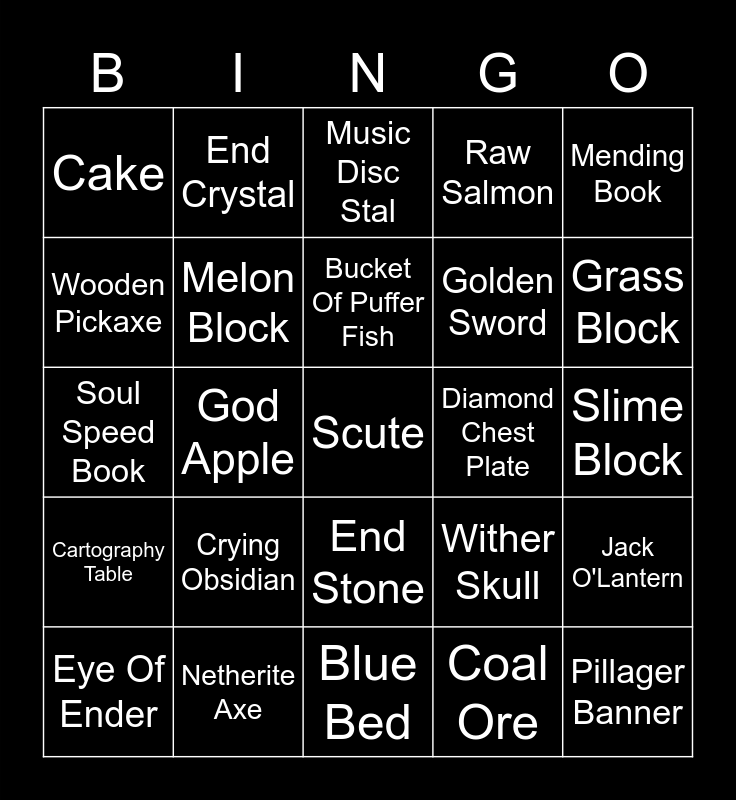 This bingo card has a free space and 24 words: Crying Obsidian, Netherite Axe, Bucket Of Puffer Fish, Eye Of Ender, Mending Book, Cake, Wooden Pickaxe, End Crystal, Diamond Chest Plate, End Stone, Golden Sword, Soul Speed Book, Wither Skull, Jack O'Lantern, Melon Block, Coal Ore, Slime Block, Music Disc Stal, Grass Block, God Apple, Pillager Banner, Cartography Table, Raw Salmon and Blue Bed.