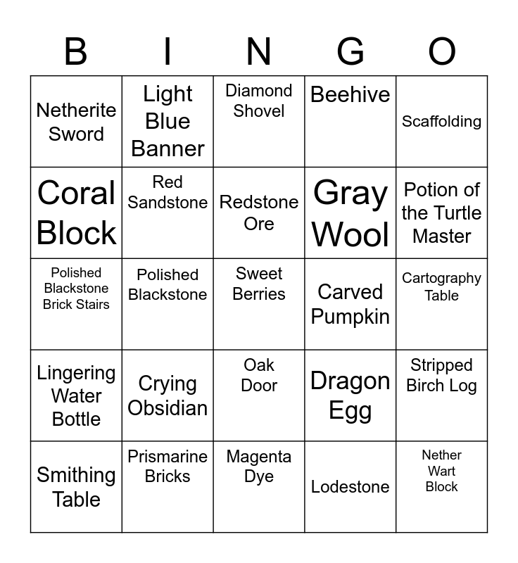 This bingo card has 25 words: Crying Obsidian, Magenta Dye, Redstone Ore, Smithing Table, Scaffolding, Netherite Sword, Coral Block, Light Blue Banner, Carved Pumpkin, Oak Door, Gray Wool, Polished Blackstone Brick Stairs, Dragon Egg, Stripped Birch Log, Red Sandstone, Nether Wart Block, Cartography Table, Diamond Shovel, Potion of the Turtle Master, Polished Blackstone, Sweet Berries, Prismarine Bricks, Lingering Water Bottle, Beehive and Lodestone.