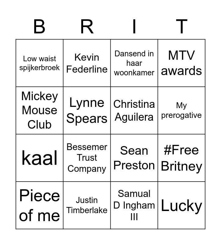 This bingo card has 16 words: Justin Timberlake, #Free Britney, Dansend in haar woonkamer, Low waist spijkerbroek, kaal, Kevin Federline, Sean Preston, Samual D Ingham III, Mickey Mouse Club, Lynne Spears, Piece of me, MTV awards, Bessemer Trust Company, My prerogative, Christina Aguilera and Lucky.