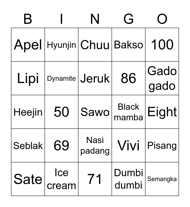 This bingo card has a free space and 24 words: 69, Ice cream, Jeruk, Sate, 100, Apel, Lipi, Hyunjin, Black mamba, Nasi padang, 86, Heejin, Vivi, Pisang, Dynamite, Dumbi dumbi, Eight, Chuu, Gado gado, 50, Semangka, Seblak, Bakso and 71.