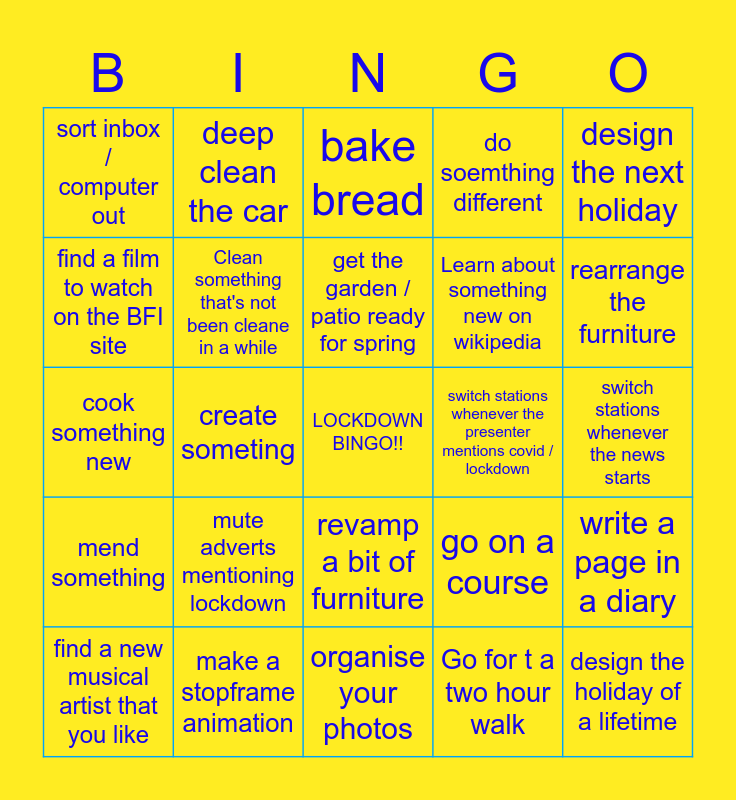 This bingo card has a free space and 24 words: mute adverts mentioning lockdown, make a stopframe animation, get the garden / patio ready for spring, find a new musical artist that you like, design the next holiday, sort inbox / computer out, find a film to watch on the BFI site, deep clean the car, switch stations whenever the presenter mentions covid / lockdown, revamp a bit of furniture, Learn about something new on wikipedia, cook something new, go on a course, write a page in a diary, Clean something that's not been cleane in a while, Go for t a two hour walk, switch stations whenever the news starts, bake bread, rearrange the furniture, create someting, design the holiday of a lifetime, mend something, do soemthing different and organise your photos.