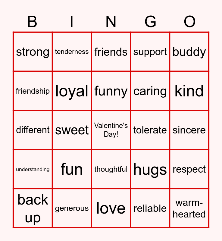 This bingo card has a free space and 27 words: hugs, tolerance, caring, love, friendship, friends, tenderness, understanding, tolerate, respect, different, support, back up, generous, kind, nice, loyal, funny, fun, strong, sincere, reliable, sweet, warm-hearted, thoughtful, buddy and pal.