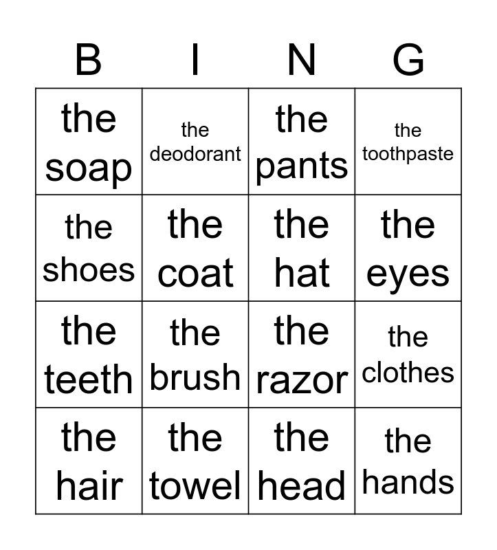 This bingo card has 16 words: the towel, the clothes, the pants, the soap, the teeth, the deodorant, the razor, the head, the shoes, the coat, the hair, the toothpaste, the brush, the eyes, the hat and the hands.