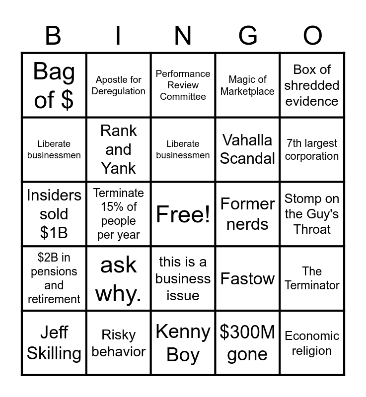 This bingo card has a free space and 29 words: Jeff Skilling, "Son of a preacher man", Terminate 15% of people per year, $5M bonus!, Bag of $, Performance Review Committee, Rank and Yank, ask why., Former nerds, Risky behavior, Stomp on the Guy's Throat, Economic religion, Kenny Boy, $300M gone, 7th largest corporation, Ken Lay, this is a business issue, $2B in pensions and retirement, Box of shredded evidence, Insiders sold $1B, Fastow, Integrity &Truthfulness, Vahalla Scandal, Liberate businessmen, Magic of Marketplace, Apostle for Deregulation, The Terminator, Liberate businessmen and Sharon Watkins.