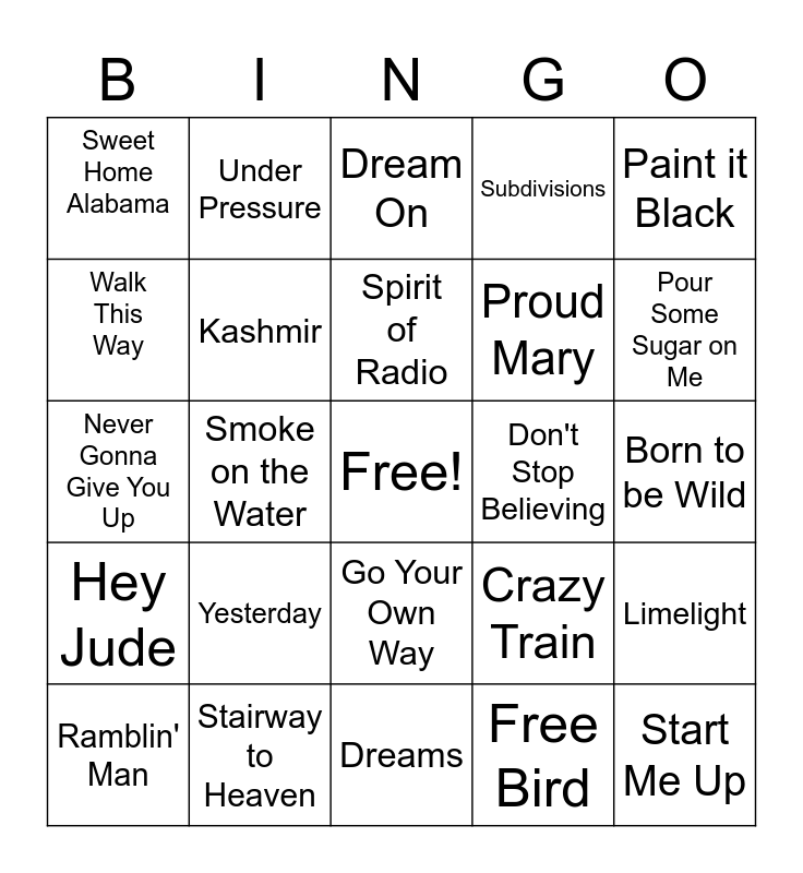 This bingo card has a free space and 30 words: Stairway to Heaven, More Than a Feeling, Smoke on the Water, Carry on Wayward Song, Sweet Home Alabama, Dream On, Kashmir, Go Your Own Way, Don't Stop Believing, Dreams, Born to be Wild, Start Me Up, Free Bird, You Ain't Seen Nothing Yet, Pour Some Sugar on Me, Old Time Rock and Roll, Crazy Train, Hey Jude, Yesterday, Paint it Black, Never Gonna Give You Up, Good Vibration, Under Pressure, Proud Mary, Walk This Way, Subdivisions, Limelight, Ramblin' Man, Spirit of Radio and Crazy Little Thing Called Love.