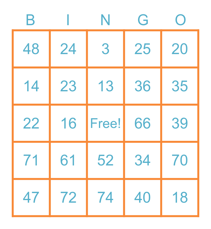This bingo card has a free space and 75 words: 1, 2, 3, 4, 5, 6, 7, 8, 9, 10, 11, 12, 13, 14, 15, 16, 17, 18, 19, 20, 21, 22, 23, 24, 25, 26, 27, 28, 29, 30, 31, 32, 33, 34, 35, 36, 37, 38, 39, 40, 41, 42, 43, 44, 45, 46, 47, 48, 49, 50, 51, 52, 53, 54, 55, 56, 57, 58, 59, 60, 61, 62, 63, 64, 65, 66, 67, 68, 69, 70, 71, 72, 73, 74 and 75.
