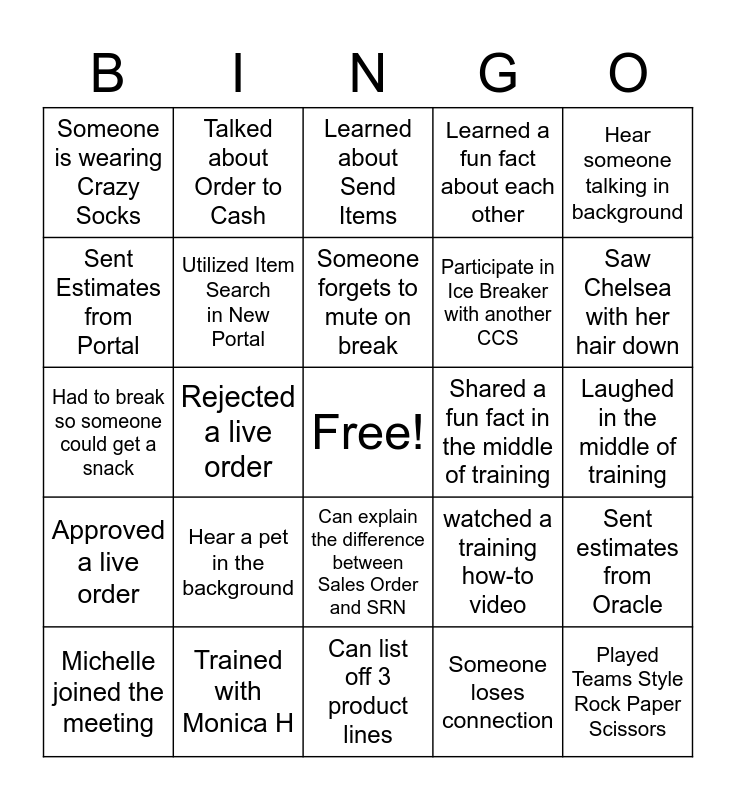 This bingo card has a free space and 24 words: Michelle joined the meeting, Hear a pet in the background, Someone forgets to mute on break, Someone loses connection, Hear someone talking in background, Someone is wearing Crazy Socks, Talked about Order to Cash, Learned about Send Items, Shared a fun fact in the middle of training, Laughed in the middle of training, Had to break so someone could get a snack, Utilized Item Search in New Portal, watched a training how-to video, Sent estimates from Oracle, Sent Estimates from Portal, Trained with Monica H, Can list off 3 product lines, Learned a fun fact about each other, Saw Chelsea with her hair down, Approved a live order, Rejected a live order, Can explain the difference between Sales Order and SRN, Participate in Ice Breaker with another CCS and Played Teams Style Rock Paper Scissors.