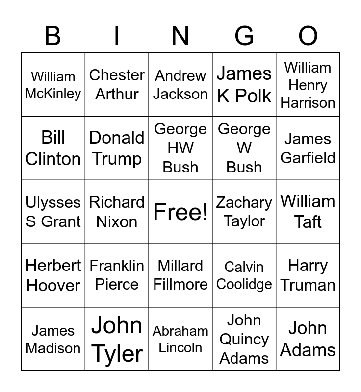 This bingo card has a free space and 45 words: George Washington, John Adams, Thomas Jefferson, James Madison, James Monroe, John Quincy Adams, Andrew Jackson, Martin Van Buren, William Henry Harrison, John Tyler, James K Polk, Zachary Taylor, Millard Fillmore, Franklin Pierce, James Buchanan, Abraham Lincoln, Andrew Johnson, Ulysses S Grant, Rutherford B Hayes, James Garfield, Chester Arthur, Grover Cleveland, Benjamin Harrison, William McKinley, Theodore Roosevelt, William Taft, Woodrow Wilson, Warren Harding, Calvin Coolidge, Herbert Hoover, Franklin D Roosevelt, Harry Truman, Dwight Esienhower, John F Kennedy, Lyndon Jonhson, Richard Nixon, Gerald Ford, Jimmy Carter, Ronald Reagan, George HW Bush, Bill Clinton, George W Bush, Barack Obama, Donald Trump and Joe Biden.