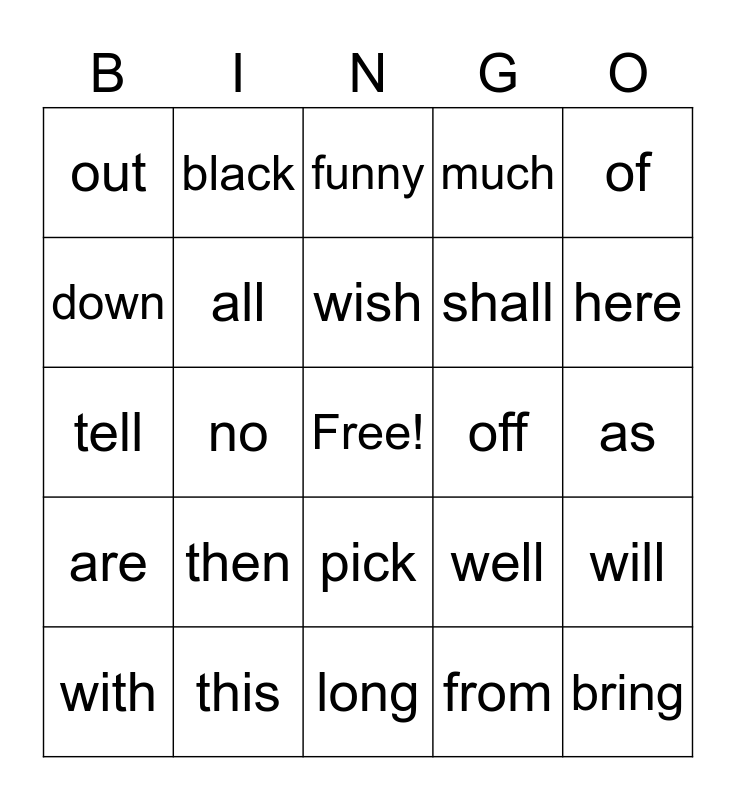 This bingo card has a free space and 24 words: then, this, wish, with, of, out, down, black, off, pick, shall, tell, well, will, all, from, as, funny, here, no, bring, are, much and long.