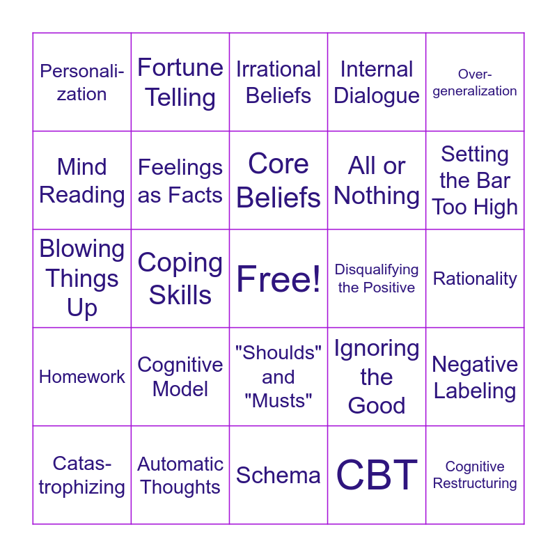 This bingo card has a free space and 24 words: Cognitive Model, Automatic Thoughts, Core Beliefs, Catas-trophizing, Over-generalization, Personali-zation, Mind Reading, Fortune Telling, Disqualifying the Positive, "Shoulds" and "Musts", All or Nothing, Blowing Things Up, Ignoring the Good, Negative Labeling, Feelings as Facts, CBT, Rationality, Irrational Beliefs, Setting the Bar Too High, Coping Skills, Cognitive Restructuring, Homework, Internal Dialogue and Schema.