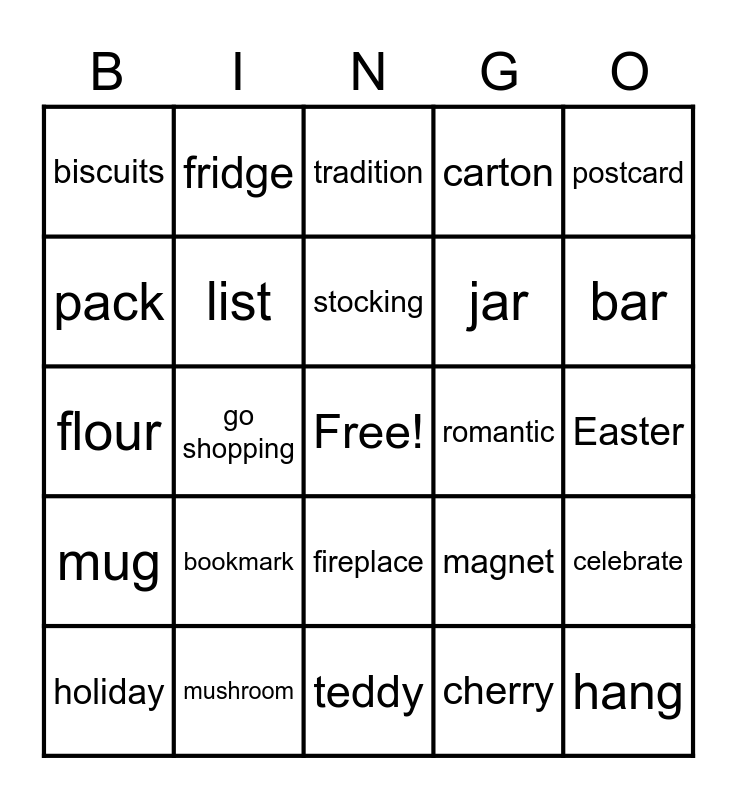 This bingo card has a free space and 24 words: bookmark, mushroom, stocking, holiday, postcard, biscuits, pack, fridge, romantic, fireplace, jar, flour, magnet, celebrate, list, cherry, Easter, tradition, bar, go shopping, hang, mug, carton and teddy.