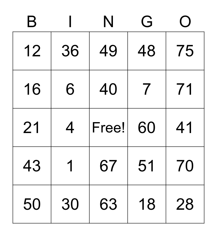 This bingo card has a free space and 24 words: 1, 30, 40, 50, 75, 12, 16, 36, 60, 67, 7, 21, 51, 70, 6, 18, 41, 49, 71, 4, 28, 43, 48 and 63.