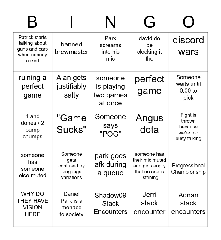 This bingo card has a free space and 29 words: WHY DO THEY HAVE VISION HERE, I don't want to play anymore, "Game Sucks", barking dog, Patrick starts talking about guns and cars when nobody asked, Park screams into his mic, Alan gets justifiably salty, Someone gets confused by language variations, Angus dota, Daniel Park is a menace to society, Fight is thrown because we're too busy talking, Adnan stack encounters, Shadow09 Stack Encounters, Jerri stack encounter, Someone waits until 0:00 to pick, non-dota player gets angry that the bois are playing dota, park goes afk during a queue, someone has someone else muted, discord wars, 1 and dones / 2 pump chumps, someone has their mic muted and gets angry that no one is listening, bullying a rando, perfect game, ruining a perfect game, david do be clocking it tho, banned brewmaster, Progressional Championship, someone is playing two games at once and someone's computer noise comes over the mic.