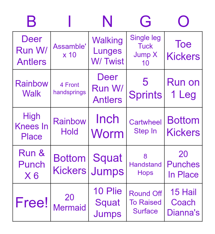 This bingo card has 27 words: 8 Handstand Hops, 15 Hail Coach Dianna's, 5 Sprints, 10 Plie Squat Jumps, Rainbow Walk, Walking Lunges W/ Twist, Assamble' x 10, Run & Punch X 6, Cartwheel Step In, 20 Punches In Place, High Knees In Place, Single leg Tuck Jump X 10, Free!, 20 Mermaid, Run on 1 Leg, Handstand Shoulder Shrugs, 4 Front handsprings, Deer Run W/ Antlers, Bottom Kickers, Deer Run W/ Antlers, Bottom Kickers, Round Off To Raised Surface, Rainbow Hold, Inch Worm, Squat Jumps, Toe Kickers and Handstand Shoulder Taps.