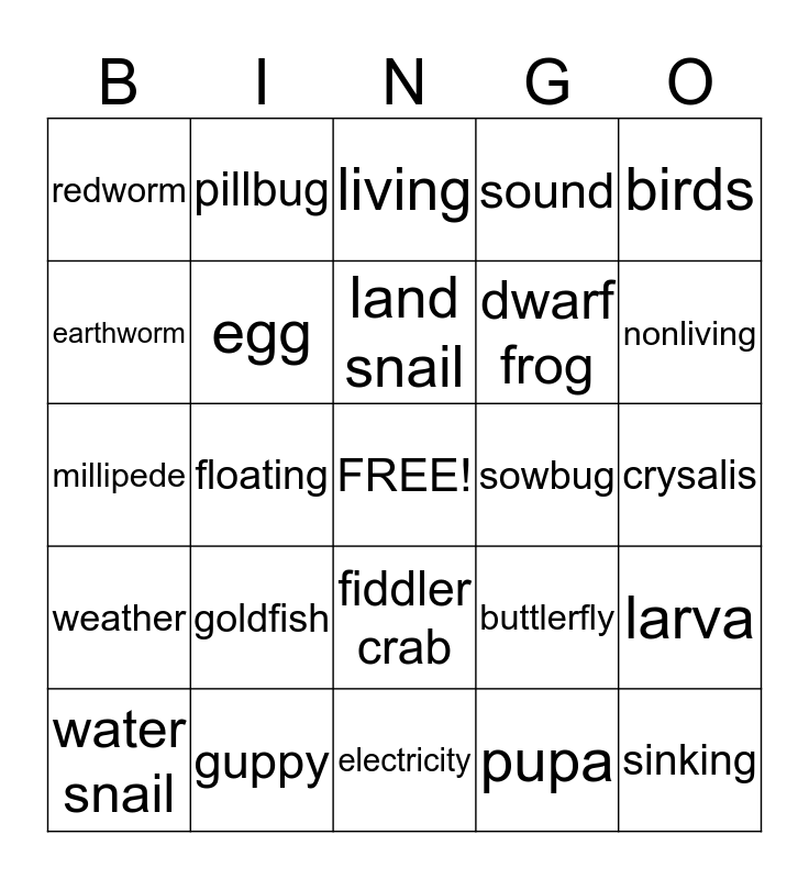 This bingo card has a free space and 24 words: goldfish, guppy, land snail, water snail, birds, redworm, earthworm, pillbug, sowbug, fiddler crab, dwarf frog, millipede, buttlerfly, larva, egg, pupa, crysalis, living, nonliving, floating, sinking, weather, sound and electricity.