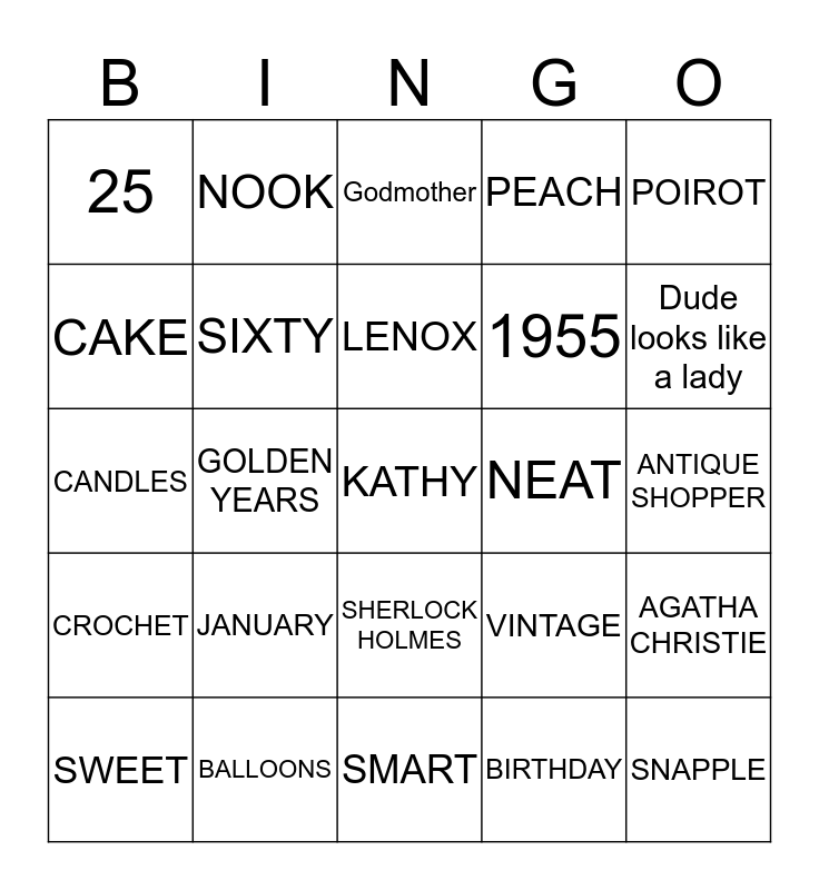 This bingo card has a free space and 24 words: JANUARY, BALLOONS, LENOX, SWEET, POIROT, 25, CAKE, NOOK, NEAT, SHERLOCK HOLMES, 1955, CANDLES, VINTAGE, AGATHA CHRISTIE, SIXTY, BIRTHDAY, ANTIQUE SHOPPER, Godmother, Dude looks like a lady, GOLDEN YEARS, SNAPPLE, CROCHET, PEACH and SMART.