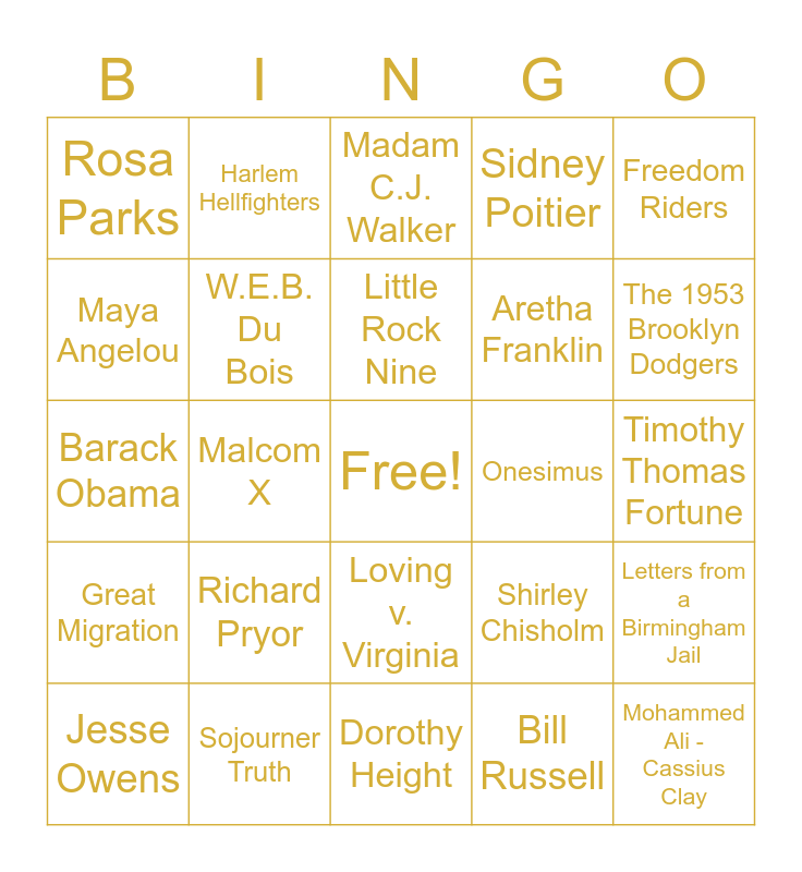 This bingo card has a free space and 60 words: MLK Jr., Sojourner Truth, Condoleezza Rice, Great Migration, Bill Russell, August Wilson, W.E.B. Du Bois, Niagara Movement, Aretha Franklin, Mayflower of Liberia, Sidney Poitier, Booker T. Washington, Maya Angelou, Jackie Robinson, The Children's Crusade, Rosa Parks, Mohammed Ali - Cassius Clay, Freedom Riders, Duke Ellington, Little Rock Nine, Onesimus, Madam C.J. Walker, Jesse Owens, Letters from a Birmingham Jail, NAACP, Jimi Hendrix, Thurgood Marshall, Dr. Charles Drew, The 1953 Brooklyn Dodgers, Million Man March, The Underground Railroad, Jonathan Gibbs, Kamala Harris, Ella Baker, Harlem Hellfighters, SNCC, The Souls of Black Folk, Malcom X, Harriet Tubman, Barack Obama, Lift Every Voice and Sing, Richard Pryor, Timothy Thomas Fortune, George Washington Carver, Shirley Chisholm, Bayard Rustin, Montgomery Bus Boycott, Claudette Colvin, Annie Lee Cooper, Loving v. Virginia, Dorothy Height, Marsha P. Johnson, Bessie Coleman, March on Washington, Robert Sengstacke Abbott, Ethel Waters, Gwendolyn Brooks, Alice Coachman, Jane Bolin and Gordon Parks.
