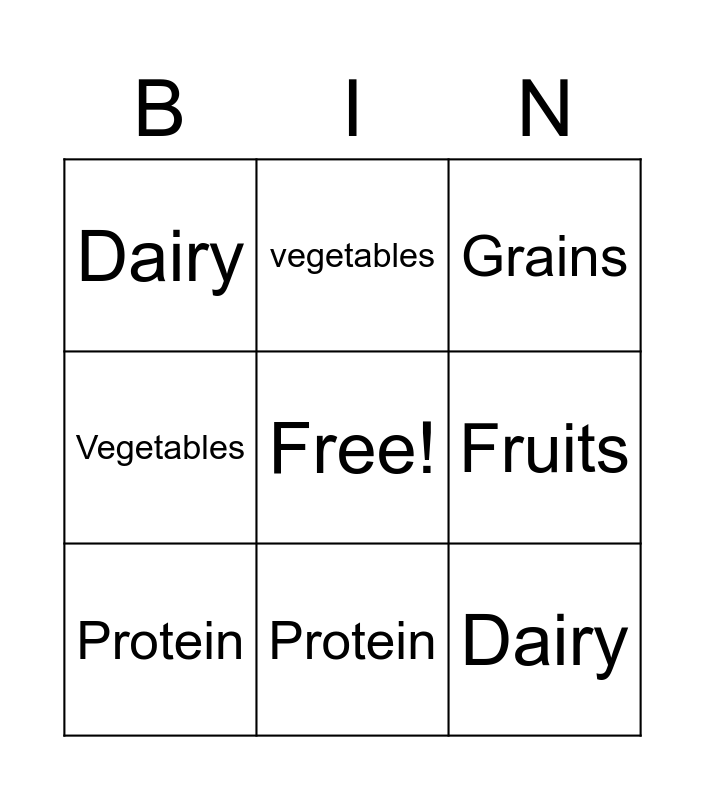 This bingo card has a free space and 8 words: Fruits, Grains, vegetables, Protein, Dairy, Dairy, Vegetables and Protein.