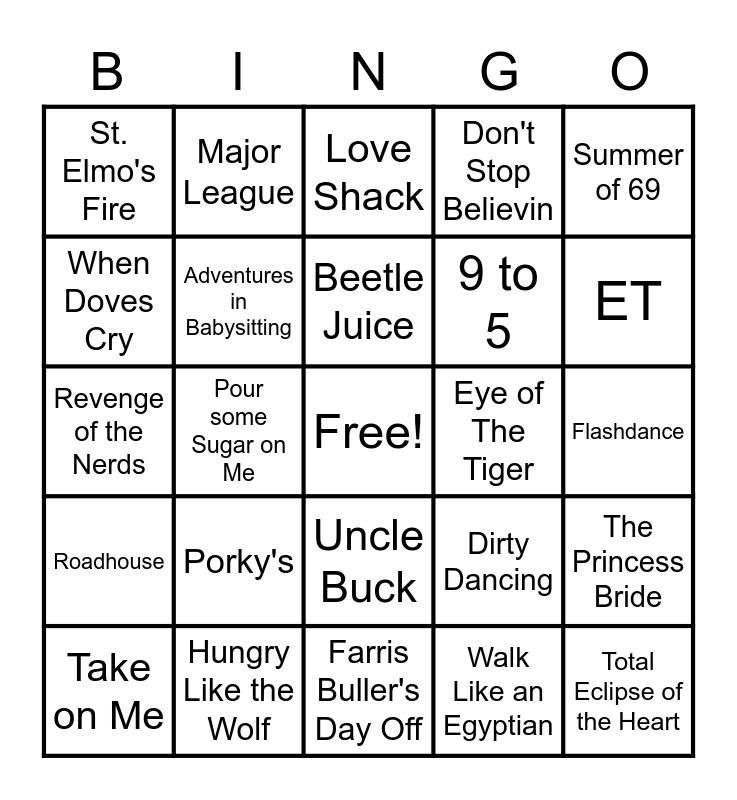 This bingo card has a free space and 44 words: Girls Just Wanna have Fun, Total Eclipse of the Heart, Sweet Child o' Mine, Take on Me, Livin On A Prayer, Walk Like an Egyptian, Love Shack, Another one Bites the Dust, Summer of 69, Hungry Like the Wolf, Don't Stop Believin, Eye of The Tiger, Uncle Buck, Porky's, Sixteen Candles, Farris Buller's Day Off, Breakfast Club, Revenge of the Nerds, Goonies, ET, Major League, Karate Kid, Rain Man, St. Elmo's Fire, Risky Business, Flashdance, Big, Footloose, Dirty Dancing, Roadhouse, Young Guns, The Princess Bride, Vacation, We got the Beat, Pour some Sugar on Me, The Safety Dance, What's Love Got to do With It, Jump, Beetle Juice, When Doves Cry, 9 to 5, Airplane, Adventures in Babysitting and Shook Me All Night Long.