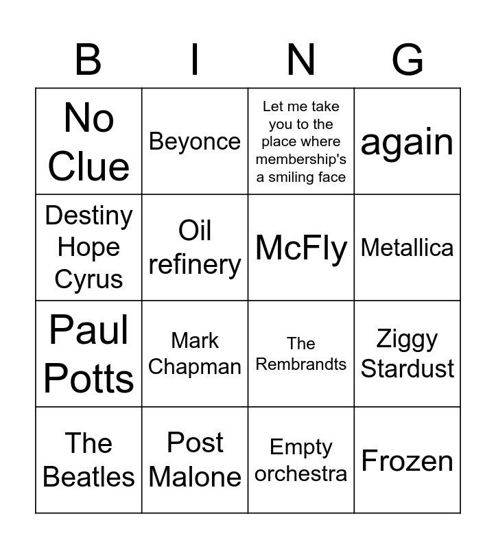 This bingo card has 25 words: Free!, Beatles, Metallica, Justin Timberlake, Destiny Hope Cyrus, No Clue, Oil refinery, Beyonce, Post Malone, Mick Jagger, Paul Potts, The Rembrandts, Denim, 1994, McFly, The Lion King, Empty orchestra, Let me take you to the place where membership's a smiling face, Mark Chapman, Ziggy Stardust, The Beatles, Pricilla, Frozen, again and Australia.