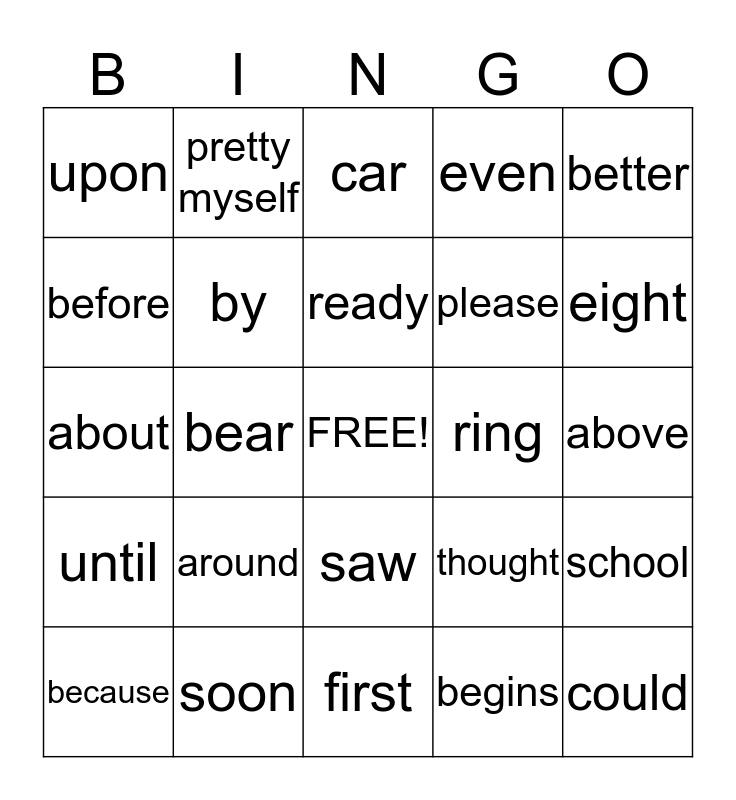 This bingo card has a free space and 24 words: around, soon, ready, because, better, upon, before, pretty myself, ring, saw, please, about, thought, school, by, begins, above, car, eight, bear, could, until, even and first.