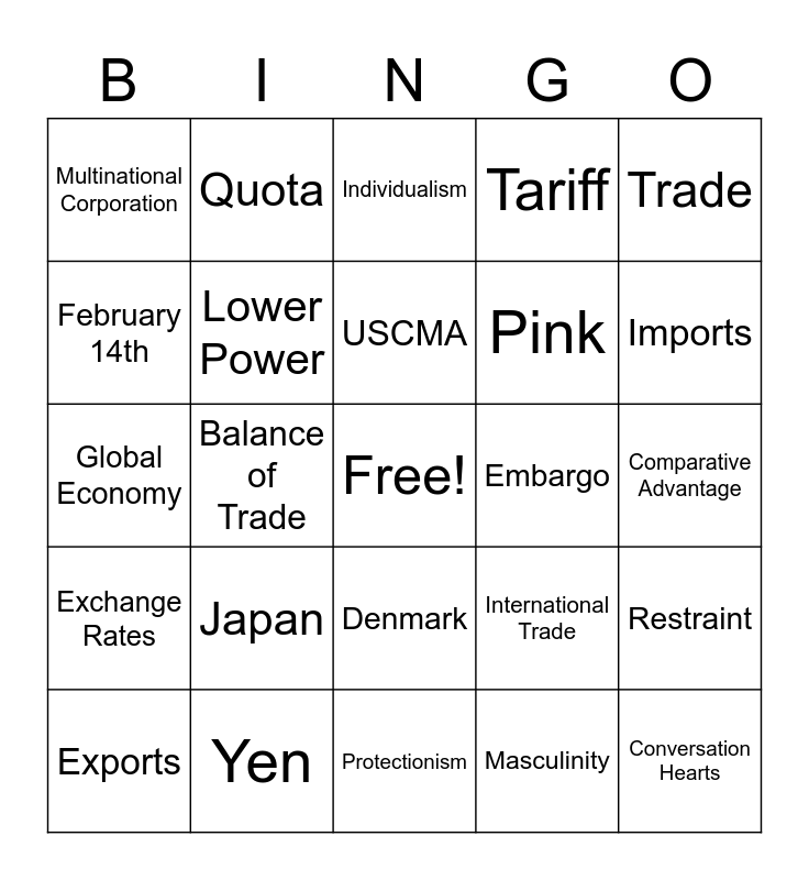 This bingo card has a free space and 24 words: Japan, Yen, USCMA, Exports, Trade, Multinational Corporation, February 14th, Quota, Embargo, Denmark, Pink, Global Economy, International Trade, Restraint, Lower Power, Masculinity, Comparative Advantage, Individualism, Imports, Balance of Trade, Conversation Hearts, Exchange Rates, Tariff and Protectionism.
