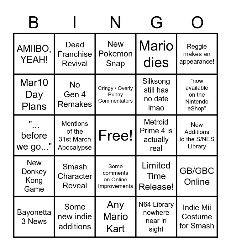 This bingo card has a free space and 29 words: Bayonetta 3 News, Any Persona News, Mentions of the 31st March Apocalypse, Zelda 35th Anniversary - it's-all-just- ports-edition, AMIIBO, YEAH!, New Pokemon Snap, No Gen 4 Remakes, Smash Character Reveal, Metroid Prime 4 is actually real, Some new indie additions, New Additions to the S/NES Library, Indie Mii Costume for Smash, Any Mario Kart, N64 Library nowhere near in sight, "now available on the Nintendo eShop", ARMS 2, Some comments on Online Improvements, New Donkey Kong Game, Reggie makes an appearance!, "... before we go...", Limited Time Release!, Galaxy 2's existence gets acknowledged, Silksong still has no date lmao, Mar10 Day Plans, Mario dies, Dead Franchise Revival, GB/GBC Online, Cringy / Overly Punny Commentators and Kingdom Hearts for Switch.