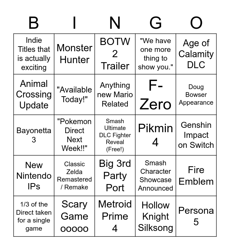 This bingo card has a free space and 24 words: Classic Zelda Remastered / Remake, Scary Game ooooo, Anything new Mario Related, 1/3 of the Direct taken for a single game, Age of Calamity DLC, Indie Titles that is actually exciting, Animal Crossing Update, Monster Hunter, Pikmin 4, Big 3rd Party Port, F-Zero, Bayonetta 3, Smash Character Showcase Announced, Fire Emblem, "Available Today!", Hollow Knight Silksong, Genshin Impact on Switch, BOTW 2 Trailer, Doug Bowser Appearance, "Pokemon Direct Next Week!!", Persona 5, New Nintendo IPs, "We have one more thing to show you." and Metroid Prime 4.