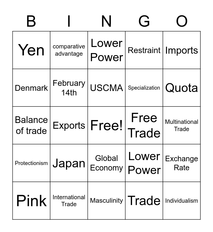 This bingo card has a free space and 24 words: Japan, International Trade, USCMA, Pink, Imports, Yen, Denmark, comparative advantage, Free Trade, Global Economy, Specialization, Balance of trade, Lower Power, Exchange Rate, February 14th, Trade, Multinational Trade, Lower Power, Quota, Exports, Individualism, Protectionism, Restraint and Masculinity.