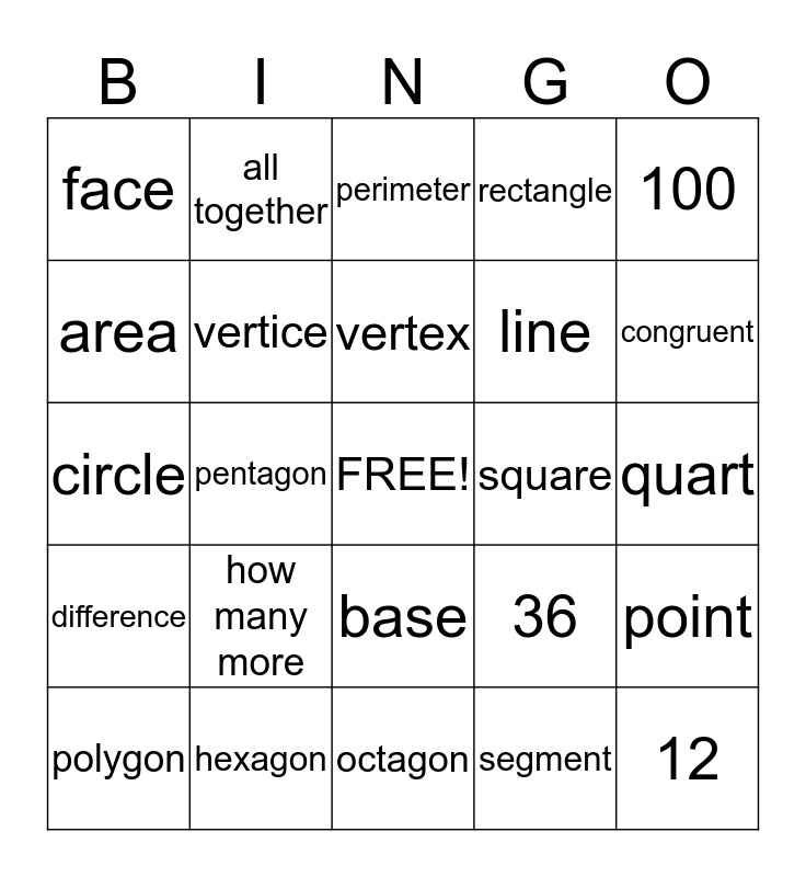 This bingo card has a free space and 28 words: point, ray, line, segment, area, perimeter, all together, difference, square, polygon, circle, rectangle, hexagon, octagon, congruent, in all, how many more, vertice, vertex, base, face, side, 12, pentagon, quart, 36, 100 and 10.