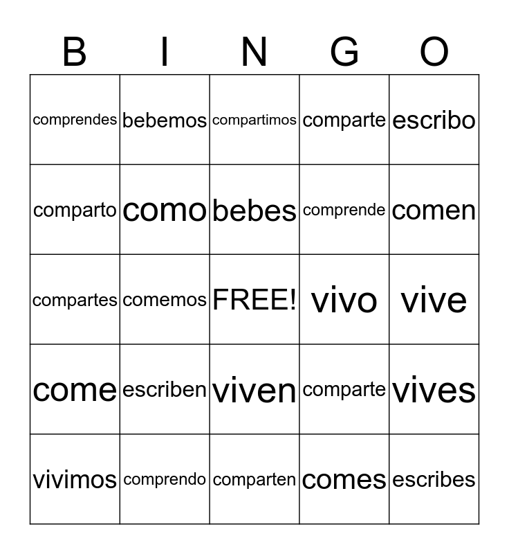 This bingo card has a free space and 24 words: escriben, comprendo, bebes, vivimos, escribo, comprendes, comparto, bebemos, vivo, viven, comprende, compartes, comparte, vives, como, comes, vive, compartimos, comen, comemos, escribes, come, comparte and comparten.