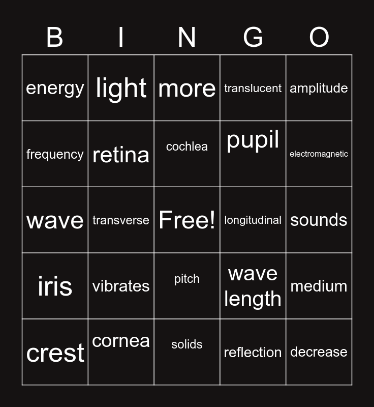 This bingo card has a free space and 24 words: vibrates, cornea, cochlea, crest, amplitude, energy, frequency, light, longitudinal, pitch, pupil, wave, wave length, medium, retina, reflection, sounds, more, electromagnetic, transverse, decrease, iris, translucent and solids.