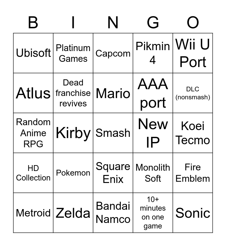 This bingo card has a free space and 24 words: Pokemon, Zelda, Mario, Metroid, Wii U Port, Ubisoft, Atlus, Platinum Games, New IP, Square Enix, AAA port, Random Anime RPG, Monolith Soft, Fire Emblem, Dead franchise revives, 10+ minutes on one game, Koei Tecmo, Capcom, DLC (nonsmash), Kirby, Sonic, HD Collection, Pikmin 4 and Bandai Namco.