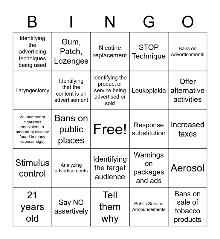 This bingo card has a free space and 28 words: Aerosol, Popcorn Lung, Leukoplakia, Public Service Announcements, Laryngectomy, Nicotine replacement, Gum, Patch, Lozenges, Stimulus control, Response substitution, 21 years old, 20 (number of cigarettes equivalent to amount of nicotine found in many vapes/e-cigs), STOP Technique, Say NO assertively, Tell them why, Offer alternative activities, Promptly leave situation, Analyzing advertisements, Identifying that the content is an advertisement, Identifying the product or service being advertised or sold, Identifying the target audience, Identifying the advertising techniques being used, Government Regulations, Bans on sale of tobacco products, Bans on public places, Increased taxes, Warnings on packages and ads, Bans on Advertisements and Oral cancer.