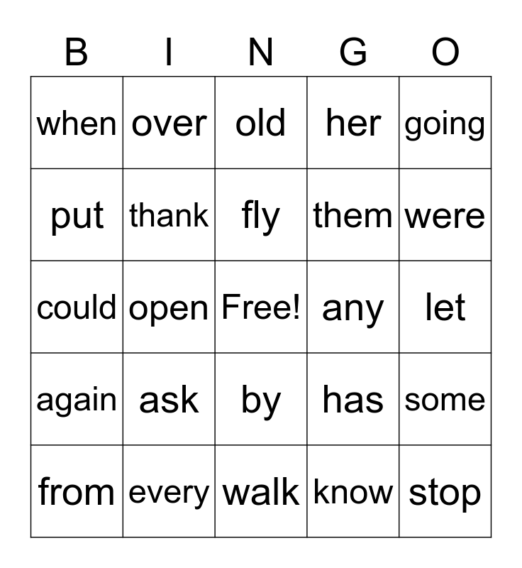 This bingo card has a free space and 24 words: ask, every, fly, from, going, when, put, over, any, by, them, could, has, some, thank, know, let, old, were, open, stop, again, her and walk.