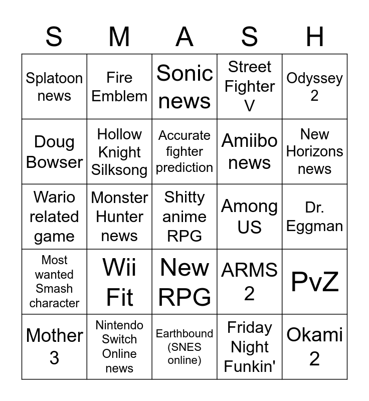 This bingo card has a free space and 36 words: Breath of the Wild 2, Metroid Prime 4, new Mario Kart, Hollow Knight Silksong, ARMS 2, Most wanted Smash character, Accurate fighter prediction, Diamond and Pearl remakes, Odyssey 2, Galaxy 2, Monster Hunter news, Street Fighter V, Any Zelda news EXCLUDING BOTW2, Among US, New Horizons news, Splatoon news, Hades related announcement, Wii Fit, Okami 2, Sonic news, Dr. Eggman, PvZ, Nintendo Switch Online news, Mother 3, Earthbound (SNES online), Fire Emblem, Wario related game, Pre-order Bonuses for any game, Amiibo news, Doug Bowser, New Controller/Joycons, Persona 5 Switch, Friday Night Funkin', New RPG, Pokemon Spin-off (excluding new Snap) and 3D all-stars updae.