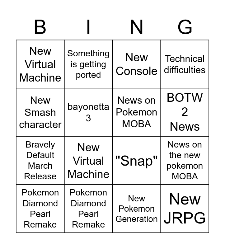 This bingo card has 21 words: Pokemon Diamond Pearl Remake, But before we go ..., Something is getting ported, New Smash Character, New Pokemon Generation, News on Pokemon MOBA, New Virtual Machine, New Console, "Snap", BOTW 2 News, Bravely Default March Release, Technical difficulties, New JRPG, Game Release same day, bayonetta 3, Minecraft update, Pokemon Diamond Pearl Remake, New Virtual Machine, New Smash character, News on the new pokemon MOBA and New Console.