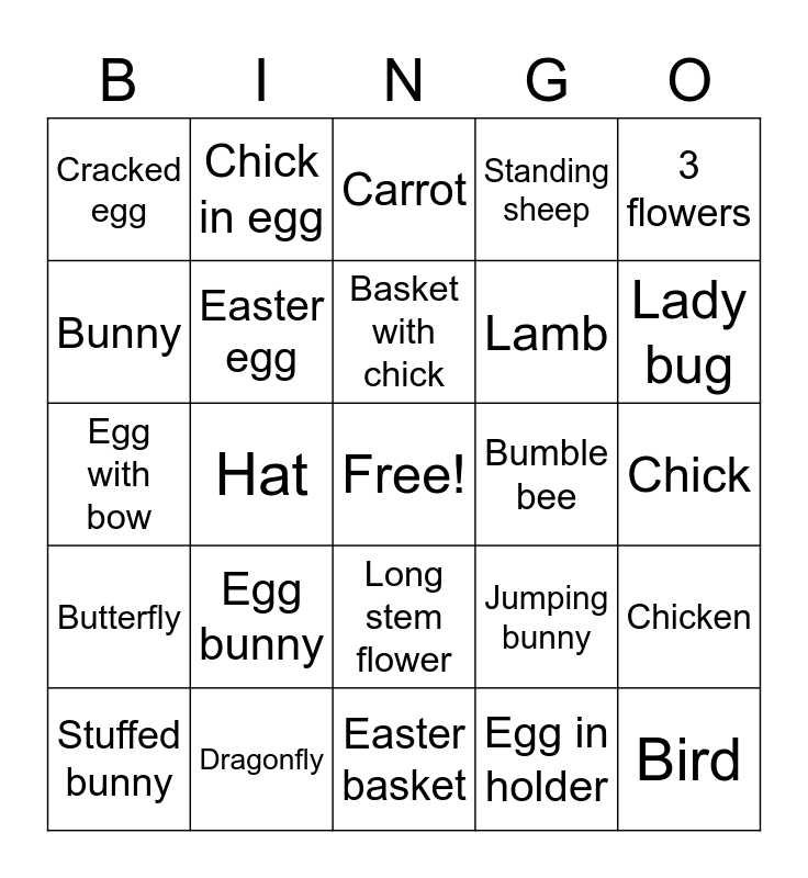 This bingo card has a free space and 24 words: Egg bunny, Dragonfly, Basket with chick, Stuffed bunny, 3 flowers, Cracked egg, Bunny, Chick in egg, Bumble bee, Long stem flower, Lamb, Egg with bow, Jumping bunny, Chicken, Easter egg, Egg in holder, Chick, Carrot, Lady bug, Hat, Bird, Butterfly, Standing sheep and Easter basket.